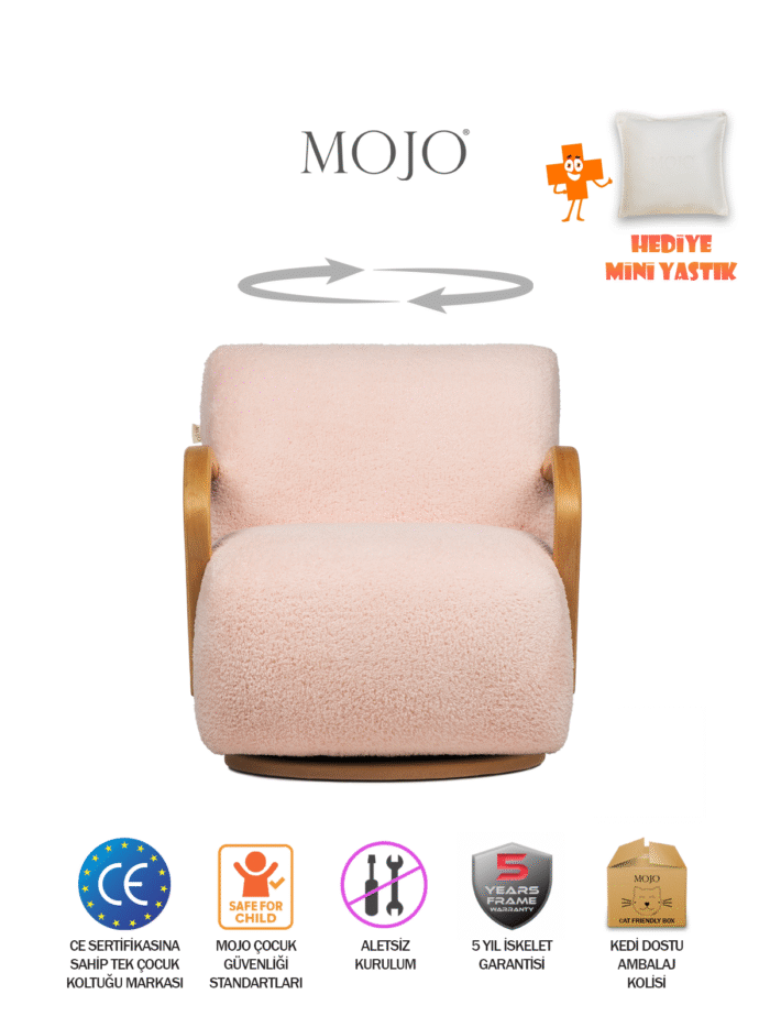 Çıtayı yükseltiyoruz! Ahşabın sıcaklığını sevenlere İskandinav tarzının en sevimli hali Soho, döner versiyonu ile karşınızda. Çok katmanlı lamine ahşaptan özel olarak şekillendirilmiş ahşap kolu hem çok sağlam hem de yuvarlatılmış köşeleri ile güvenlidir. Ayrıca çocukların kavrayabileceği ölçüdeki kolları, otururken güven vermesinin yanında, yer değişikliği yapmak istediklerinde kolayca tutup kaldırmalarını sağlar. Merak etmeyin, Soho’nun kolları tüm Mojo ürünleri gibi hem yapısal hem de bağlantı elemanları açısından sağlam ve güvenlidir. Elbette Soho kollarında kullandığımız boyanın, Avrupa Birliği çocuk sağlığı standartlarına uygun EN71 sertifikası mevcuttur. Ayrıca 360 derece dönme özelliğine sahip rulmanlı metal mekanizmalı ayak sistemi, zorlu kullanım şartlarına dayanıklı olmasının yanında, kumaş kaplı tabanı ile çocukların ayaklarına ve zemine zarar vermemesi için tasarlanmıştır.